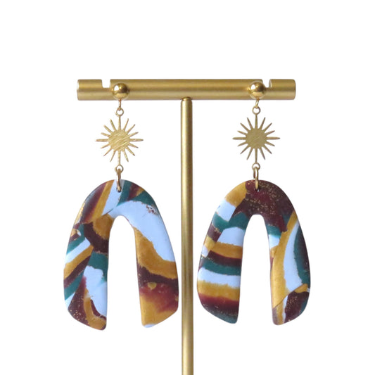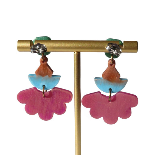 Pendientes largos amalgama en_azul pastel, verde petróleo, oro rico y rojo merlot.